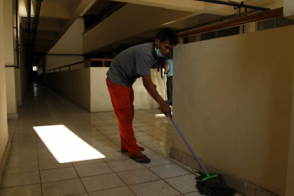 tampak sejumlah pekerja sedang membersihkan unit-unit rusun yang akan
